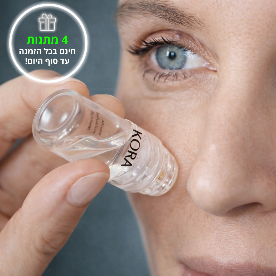העור המקומט, הסדוק והנפוח נגרם מפגיעה בשכבה שמתחת לעור ולא בעור עצמו כמו שכולם חושבים, וKORA, בעזרת טכנולוגיית מיקרו-מחט מחדיר את הסרום לעור ומעלה את הספיגה שלו בכ300%! מה שפותר את הבעיה מהשורש.
